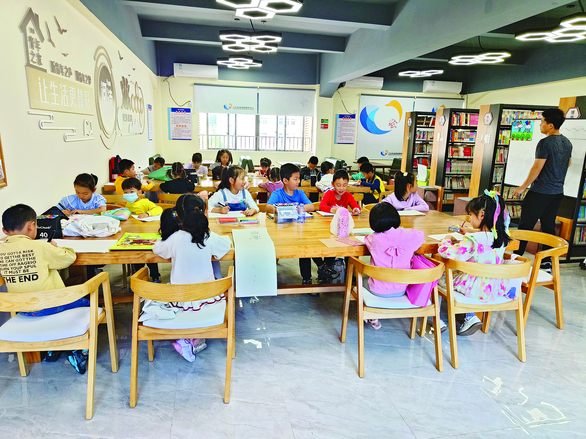 江北街道新時(shí)代文明實(shí)踐所開(kāi)展少兒繪畫(huà)公益課堂。