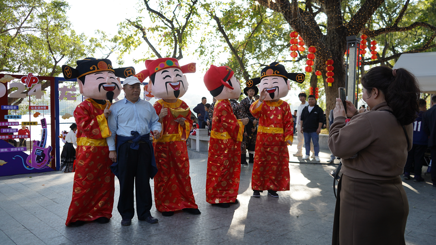 德記大排檔旁邊小廣場也布置了新年打卡背景;月亮小廣場固定布置長期打卡點,花好月圓拍照迎佳節(jié);湖邊也設(shè)置新年打卡點,到了演出時作為舞臺背景!斑@條老街好有新年氛圍,一晚上拍照都拍不停!鄙钲谟慰椭x菲菲稱贊道。