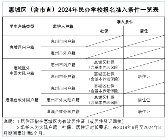 監(jiān)護人一方在2019年9月1日至2024年8月31日期間,在惠城區(qū)參加社會保險(含基本養(yǎng)老保險)時間累計滿6個月,并在惠城區(qū)居住時間累計滿6個月。