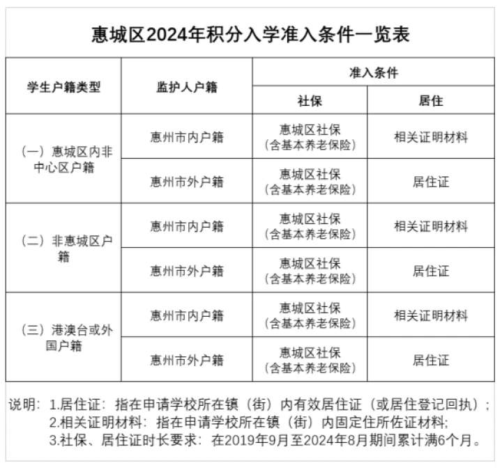 戶籍在惠城區(qū)非中心區(qū)(小金口、水口、三棟、汝湖、馬安、橫瀝、蘆洲等7鎮(zhèn)(街))的,其父親或母親或其他法定監(jiān)護人(以下簡稱“監(jiān)護人”)在2019年9月1日至2024年8月31日期間,在惠城區(qū)參加社會保險(含基本養(yǎng)老保險)時間累計滿6個月,并在戶籍地所在鎮(zhèn)(街)外居住時間累計滿6個月。