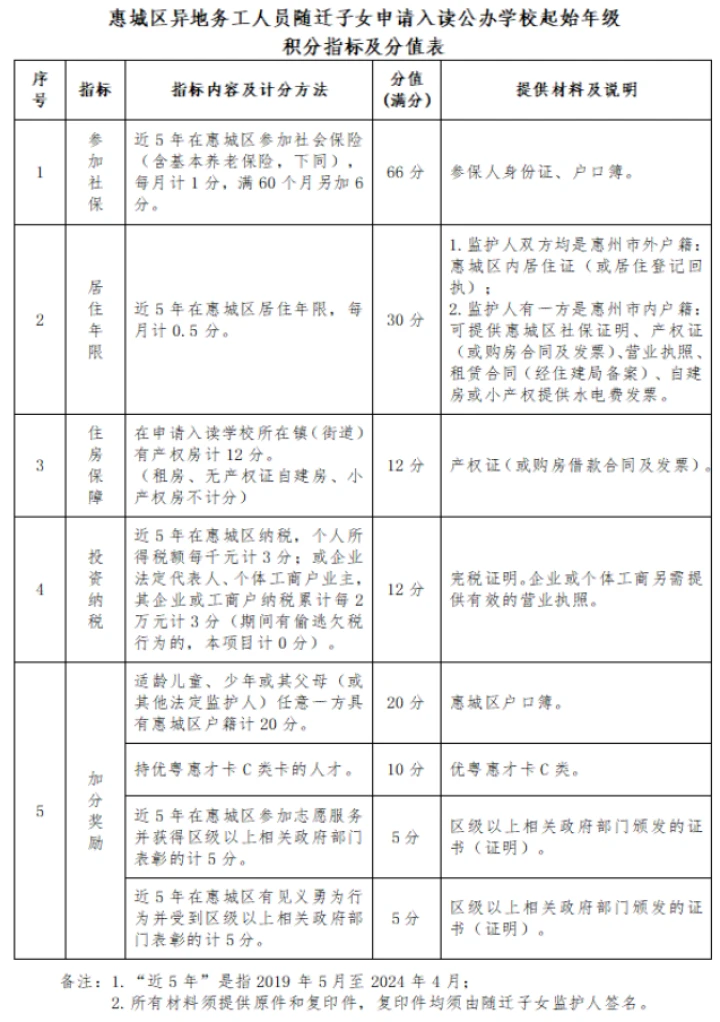 根據(jù)中共惠州市委教育工作領(lǐng)導小組辦公室、惠州市人民政府教育督導室《關(guān)于切實做好我市進城務工人員隨遷子女就學工作的通知》和惠州市教育局《關(guān)于建立義務教育階段隨遷子女積分入學制度的通知》(惠市教基〔2015〕11號)及義務教育階段學校招生工作有關(guān)文件精神,2024年我區(qū)異地務工人員隨遷子女可通過積分入學入讀義務教育階段公辦學校起始年級,F(xiàn)將積分入學相關(guān)政策做如下公告: