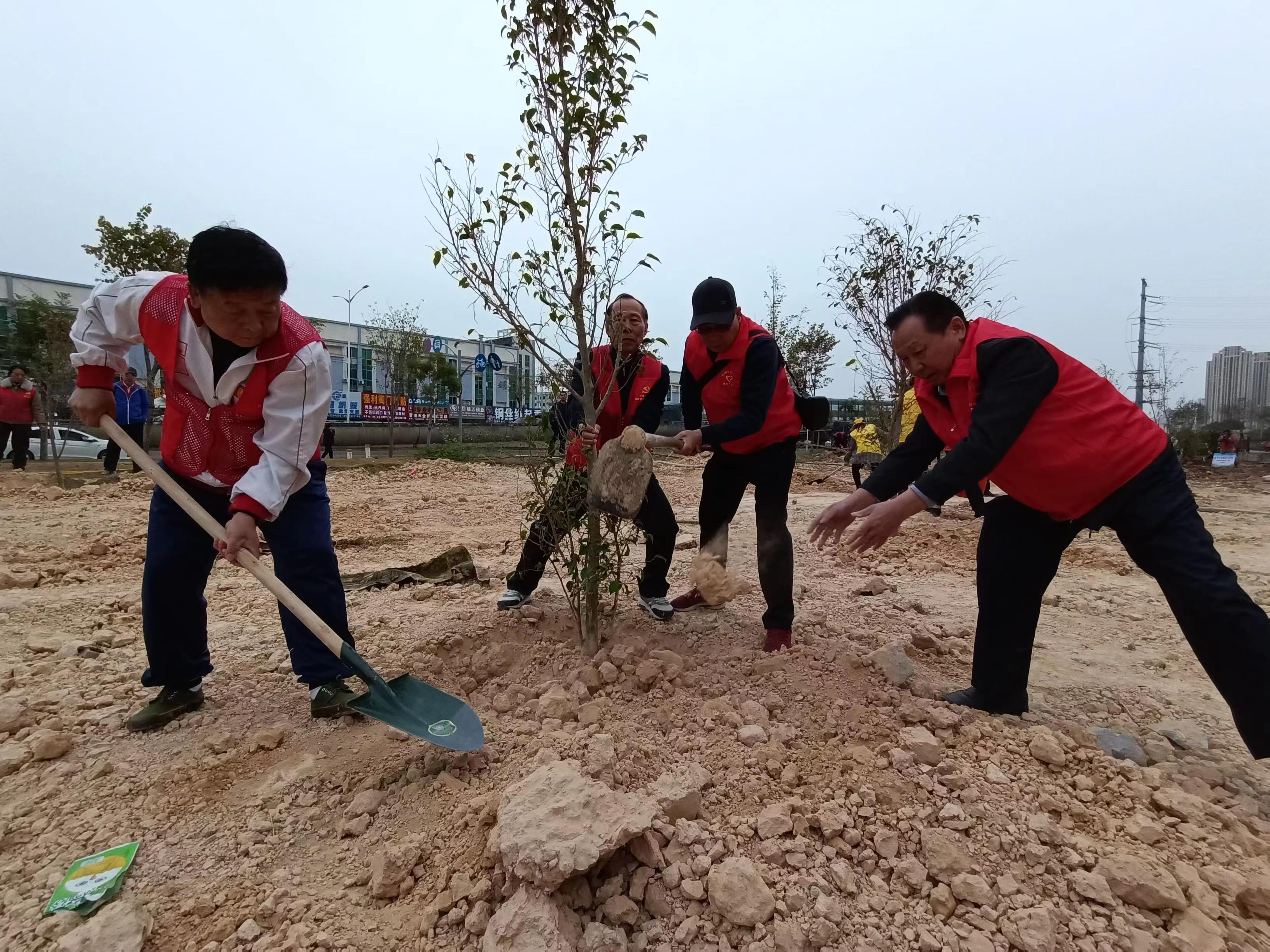 日前,在惠城區(qū)小金口金龍大道一側(cè)舉行的“綠美建設(shè) 共植共管”植樹活動(dòng)現(xiàn)場,活躍著一群志愿者,其中一批銀發(fā)老者格外引人注目,有的揮鋤挖坑,有的扶正樹苗,有的鏟土回填,干得熱火朝天,不亦樂乎。他們是來自小金口街道鐵路退休黨委的“銀齡志愿服務(wù)隊(duì)”的老黨員。