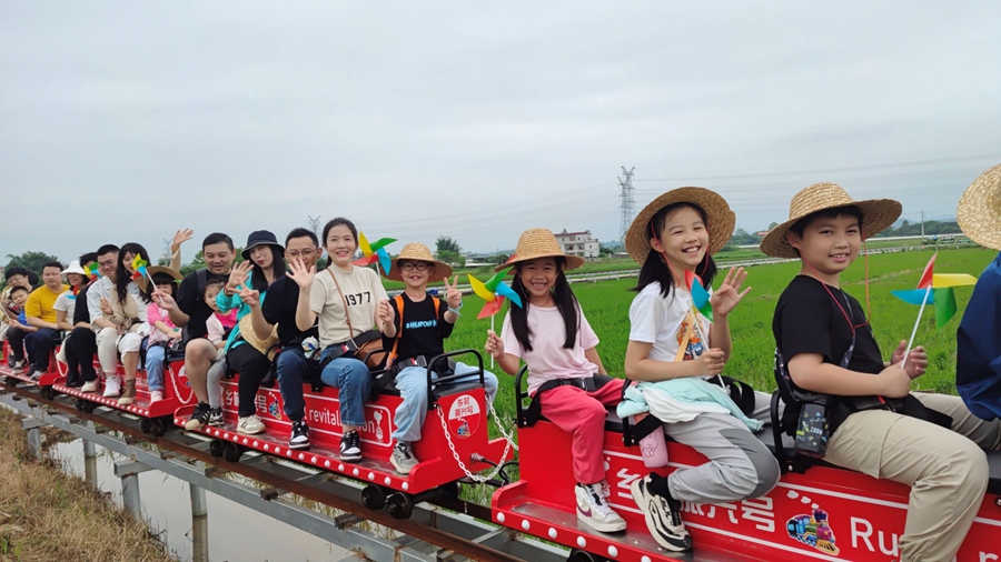 橫瀝鎮(zhèn)墨園村鄉(xiāng)村游火爆。這是游客在墨園村乘坐稻田小火車開心游玩;葜萑請笥浾吲砑t霞 通訊員劉紅蘭 攝