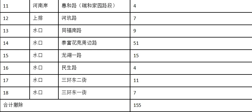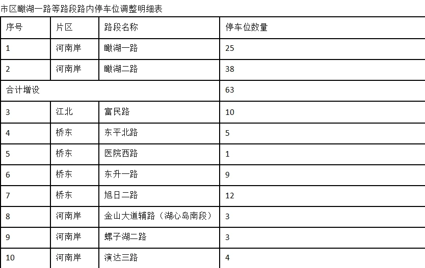 其中,河南岸片區(qū)瞰湖一路、瞰湖二路增設(shè)63個(gè)停車位。江北片區(qū)富民路,橋東東平北路、醫(yī)院西路、東升一路、旭日二路,河南岸金山大道輔路(湖心島南段)、螺子湖二路、演達(dá)三路、惠和路(瑞和家園路段),上排河坑路,水口同福南路、泰富花苑周邊路、龍湖一路、民生路、三環(huán)東二街、三環(huán)東一街16條路段撤除155個(gè)停車位。