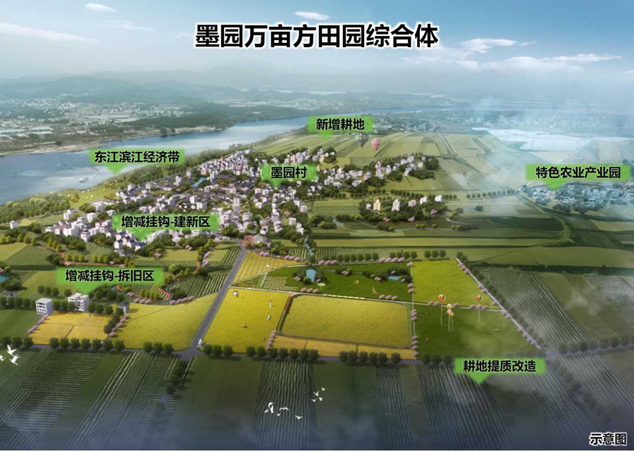 墨園萬畝方田園綜合體項目讓“小田變大田”。這是項目規(guī)劃效果圖(翻拍)。
