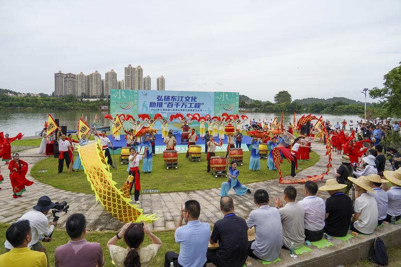 在隨后的文藝表演中,各個節(jié)目輪番上演:以東江漁家為主題情景的歌舞《鑼鼓一響慶開漁》,融合了鑼鼓、東江客家歌謠、舞龍、扇舞等藝術(shù)形式及東江漁家傳統(tǒng)民俗元素;漁家舞蹈《太陽出來喜洋洋》,通過喜慶歡快的舞蹈展示新時代農(nóng)民熱火朝天的干勁,展現(xiàn)新時代漁家人民積極昂揚、團結(jié)協(xié)作的精神面貌……據(jù)悉,此次漁家文化節(jié)的節(jié)目都是由江南街道本地村民、青年干部職工、津頭湖鑼鼓隊、舞蹈隊等參與編排演出,精彩的表演獲得了現(xiàn)場觀眾的熱烈掌聲。