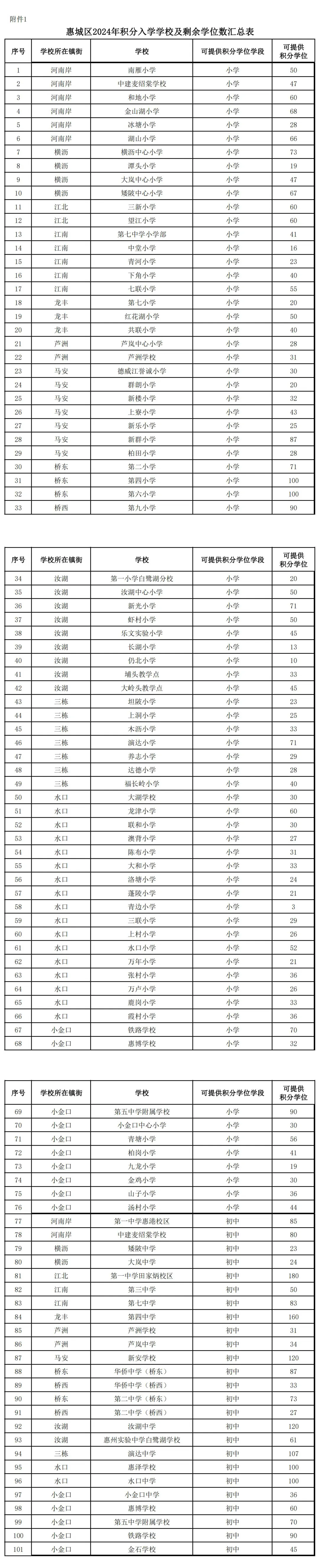。ㄒ唬└鞣e分入學(xué)學(xué)校及剩余學(xué)位數(shù)見《惠城區(qū)2024年積分入學(xué)學(xué)校及剩余學(xué)位數(shù)匯總表》(附件1)。