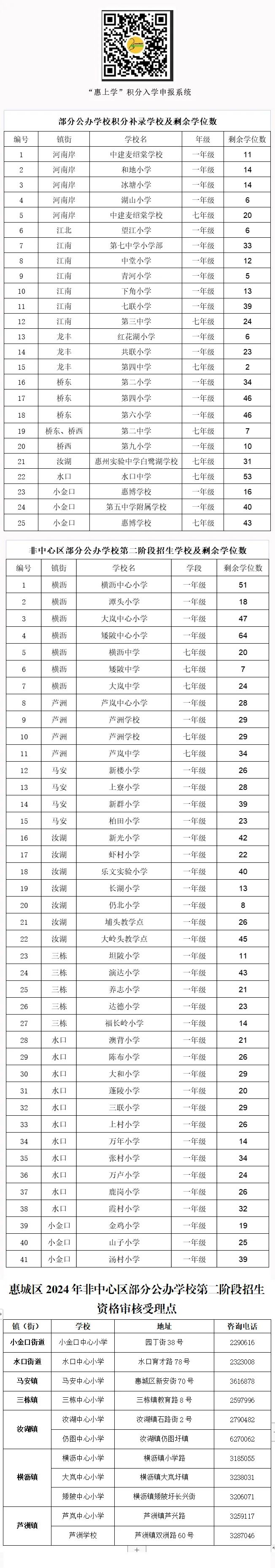根據(jù)省、市教育行政主管部門2024年招生工作相關(guān)文件精神,為充分利用好公辦學(xué)校剩余學(xué)位,現(xiàn)將有關(guān)2024年惠城區(qū)部分公辦學(xué)校積分補錄及非中心區(qū)部分公辦學(xué)校第二階段招生工作說明如下: