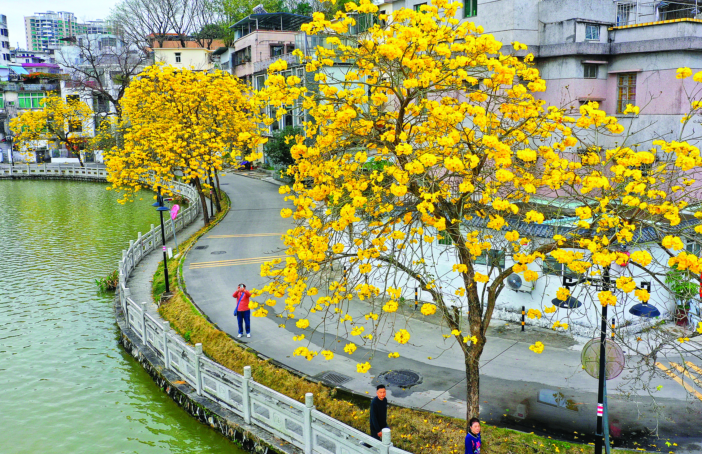 其中,惠州西湖菱湖邊上的黃花風鈴木尤為引人注目。它們沿著蜿蜒湖畔連綿分布,滿樹的金黃與澄澈的湖水交織映襯,波光花影,美不勝收。這蓬勃盛放的黃花風鈴木,已然成為惠州春日里一張極具辨識度的靚麗名片。