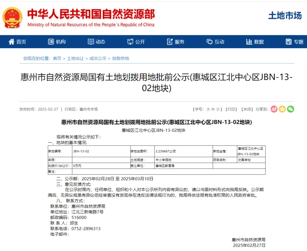 國有建設(shè)用地使用權(quán)劃撥供應(yīng)給惠城區(qū)教育局。