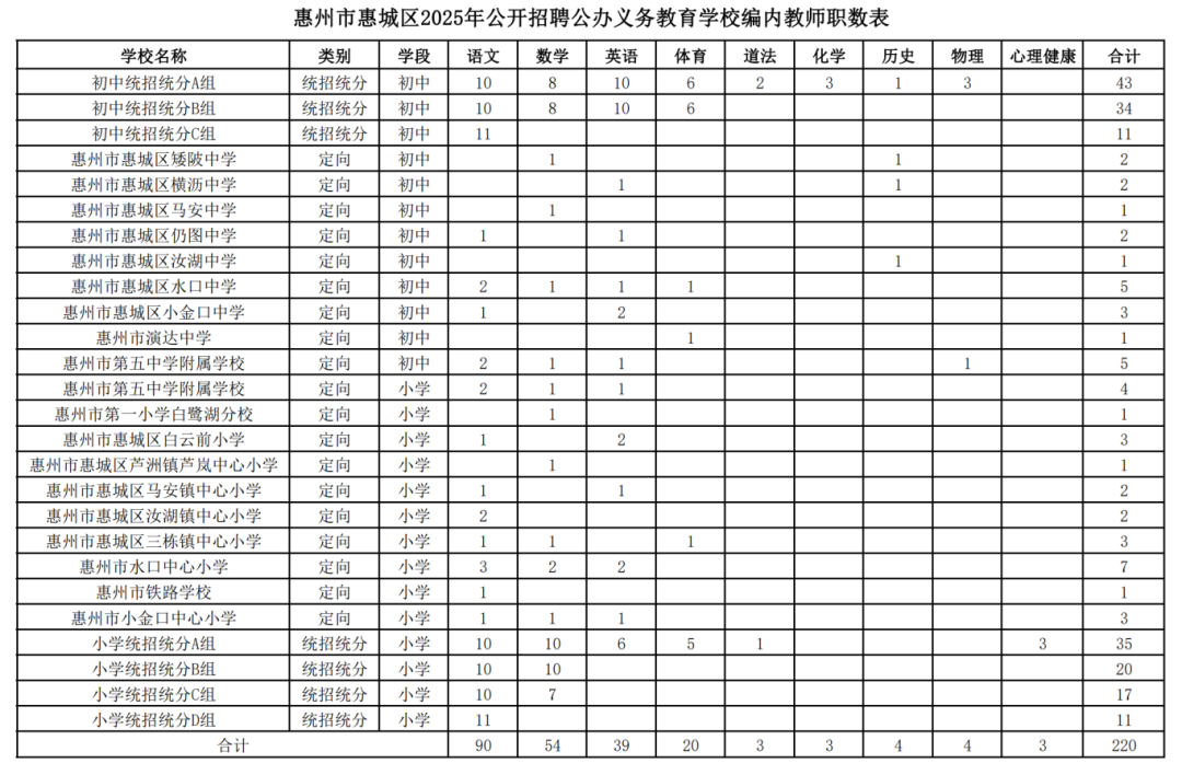 惠州市惠城區(qū)面向社會公開招聘公辦義務教育學校教師220人,應往屆畢業(yè)生、在職在崗合同制教學人員均可報名!