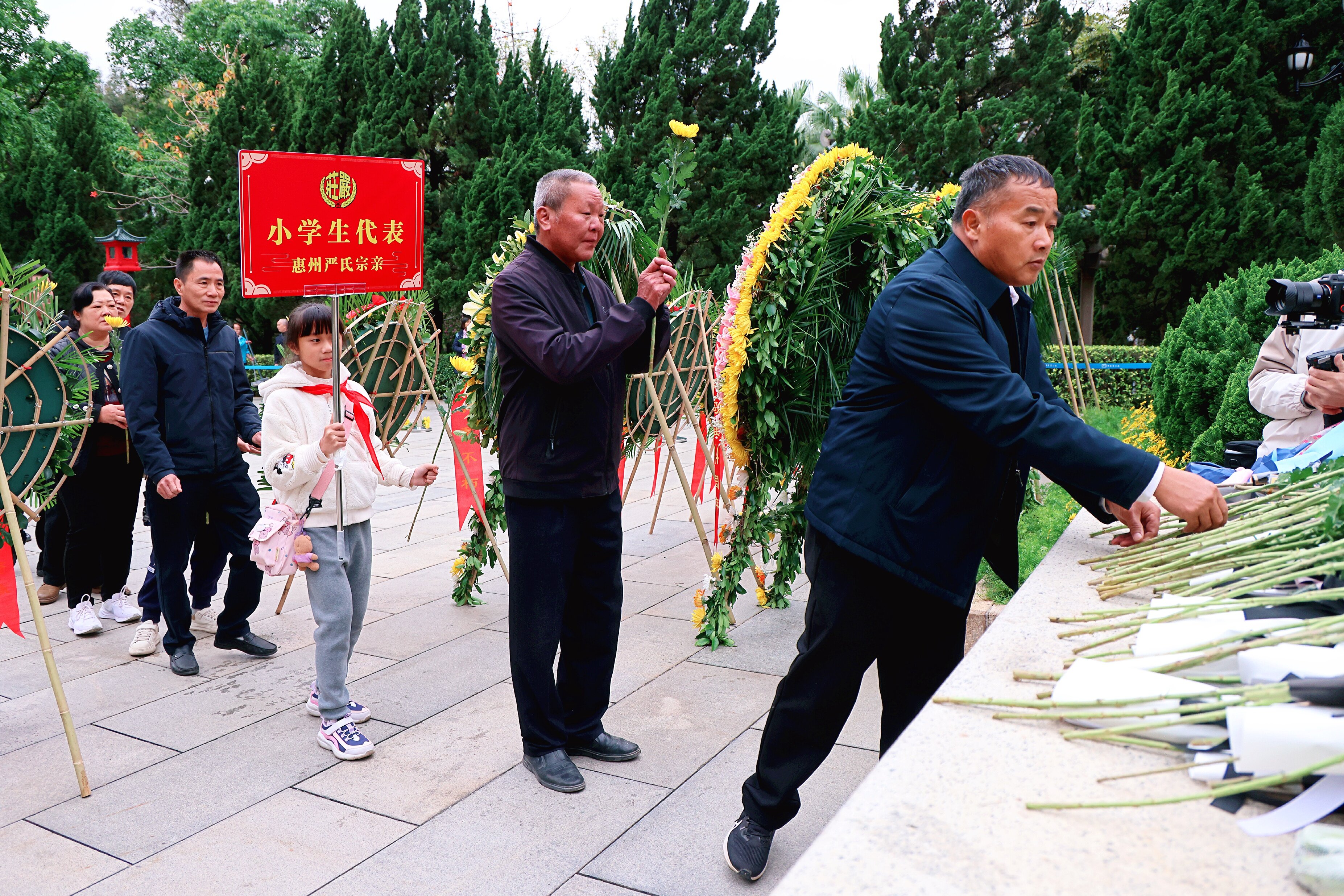 在肅穆的氛圍中由烈士陵園講解員引導,總會代表嚴金水、烈士后人代表嚴英仕、村民代表嚴夢婷等依次上前敬獻花圈,將寄托哀思的花圈敬獻于烈士紀念碑前,并鄭重整理挽聯。
