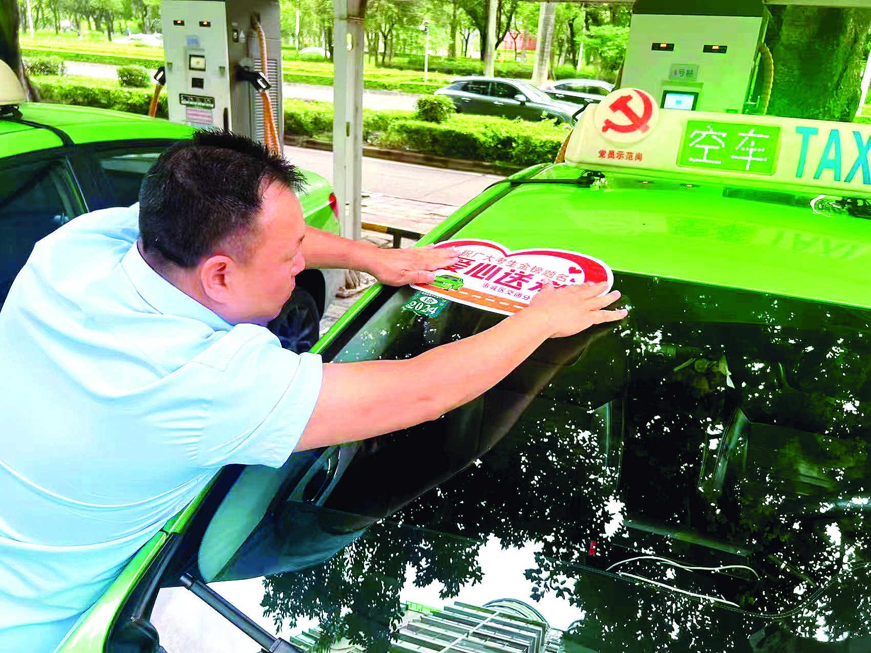 一位車主在張貼“愛心送考”標識。惠州日報記者葉文青 攝