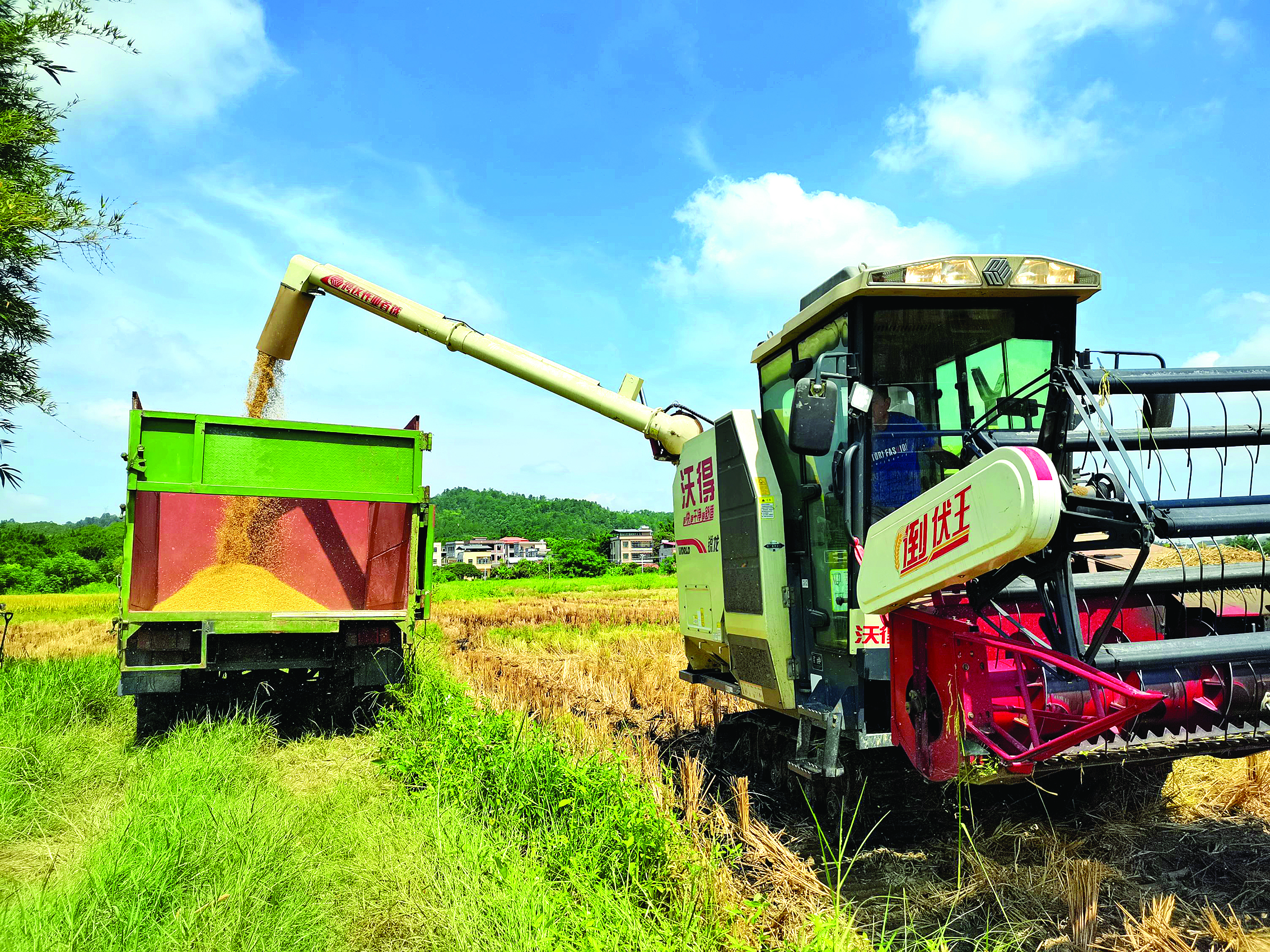采訪當(dāng)天,烈日高懸。農(nóng)民正抓緊晴好天氣在田間收割水稻。在橫瀝鎮(zhèn)洋圳村種糧大戶鄭松貴的稻田,記者看到沉甸甸的稻穗彎了腰,鄭松貴開著收割機,在田間來回穿梭。不久,一大片黃澄澄的水稻田只剩下稻茬。收割機收滿后,鄭松貴家人把一輛農(nóng)用車開到了機耕道旁。隨著一陣“轟隆隆”的機器聲響起,稻谷經(jīng)過初步去穗脫粒后,金色的“谷雨”從收割機高高架起的管道中注入農(nóng)用車,很快就裝滿了一車。