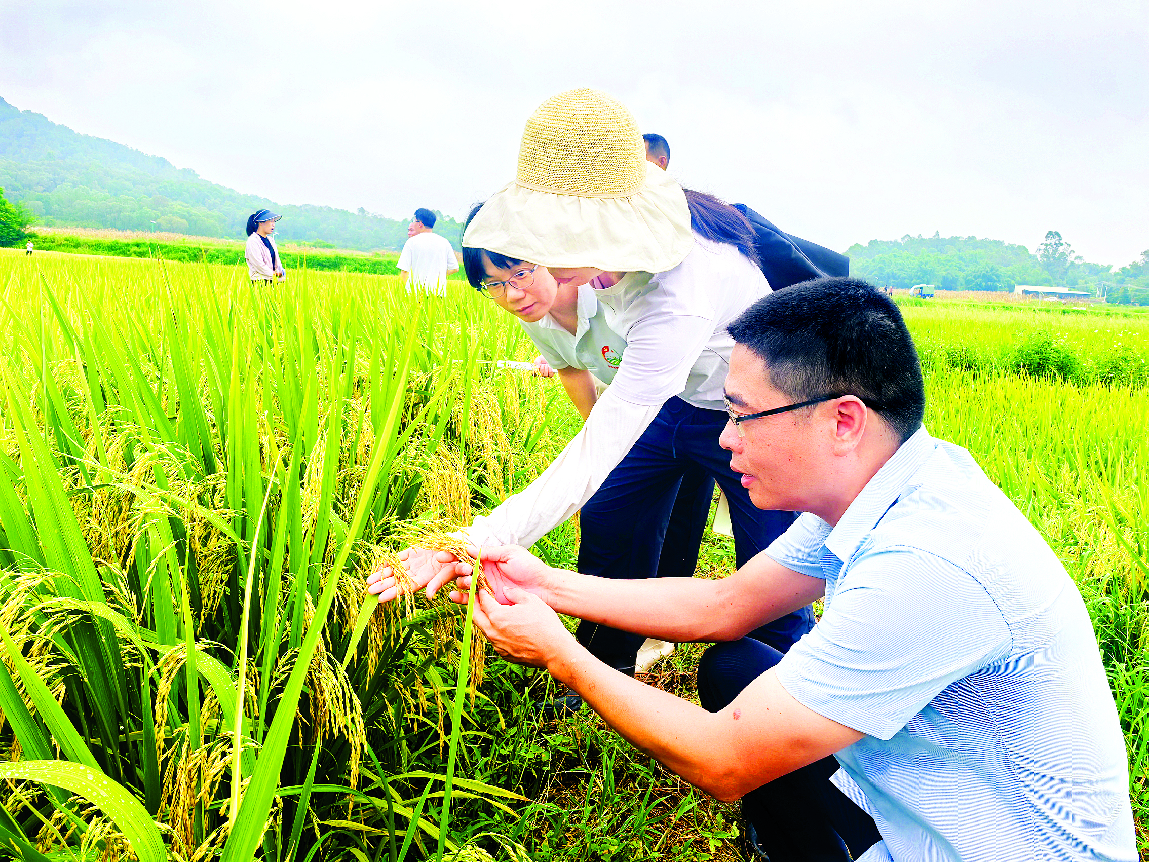 與會(huì)人員仔細(xì)觀察水稻生長(zhǎng)情況。