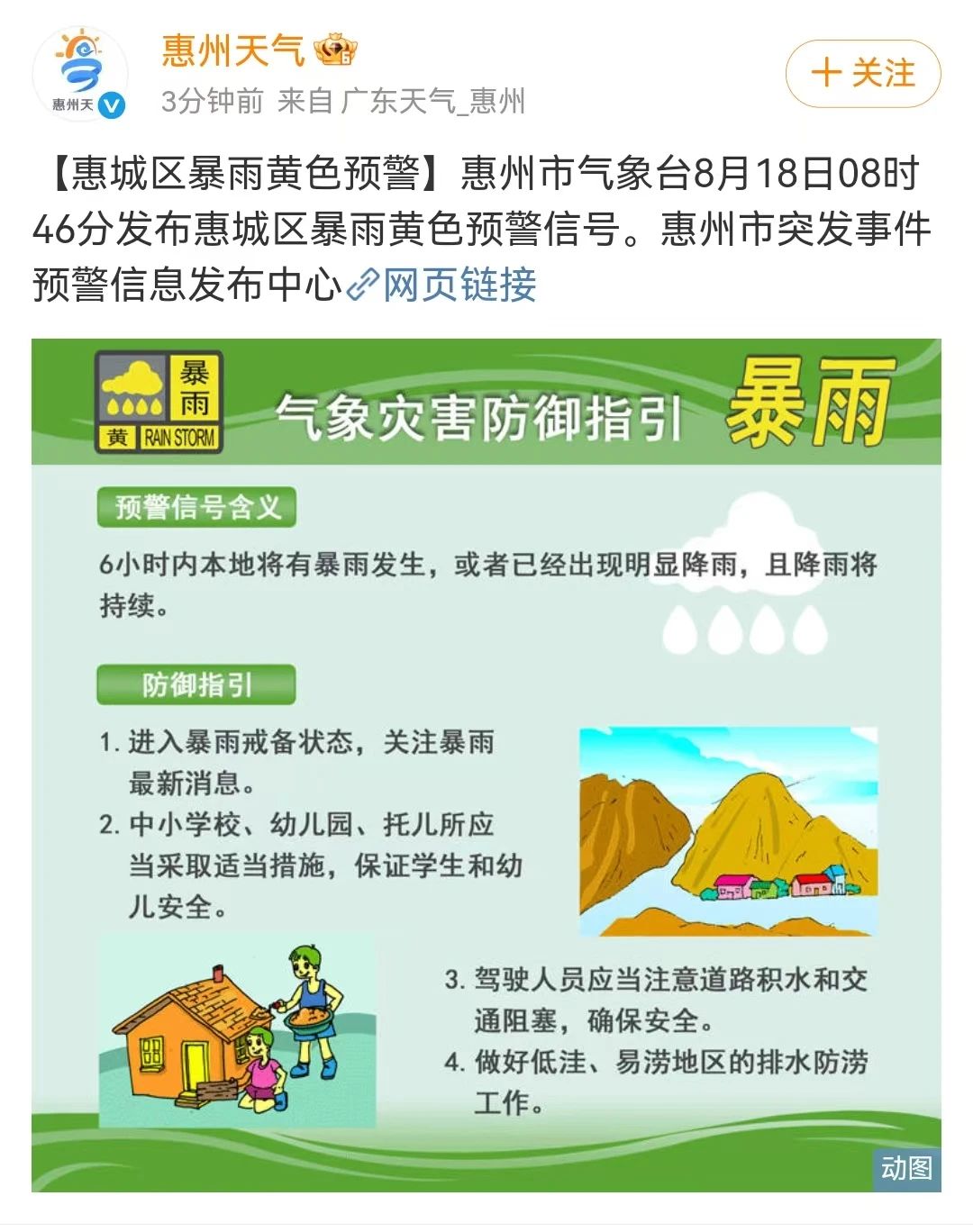 惠城區(qū)暴雨黃色預(yù)警信號(hào),