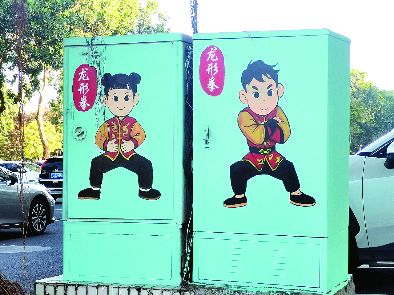 弱電箱上的龍形拳卡通形象;葜萑請笥浾吲砑t霞 攝