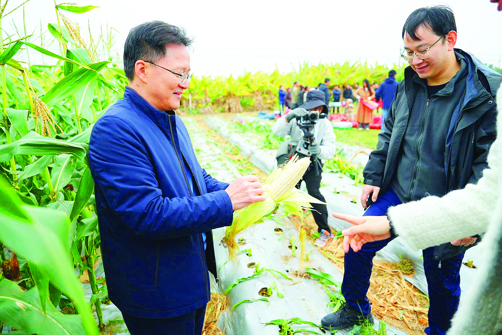 農(nóng)戶和游客一起采摘甜玉米。
