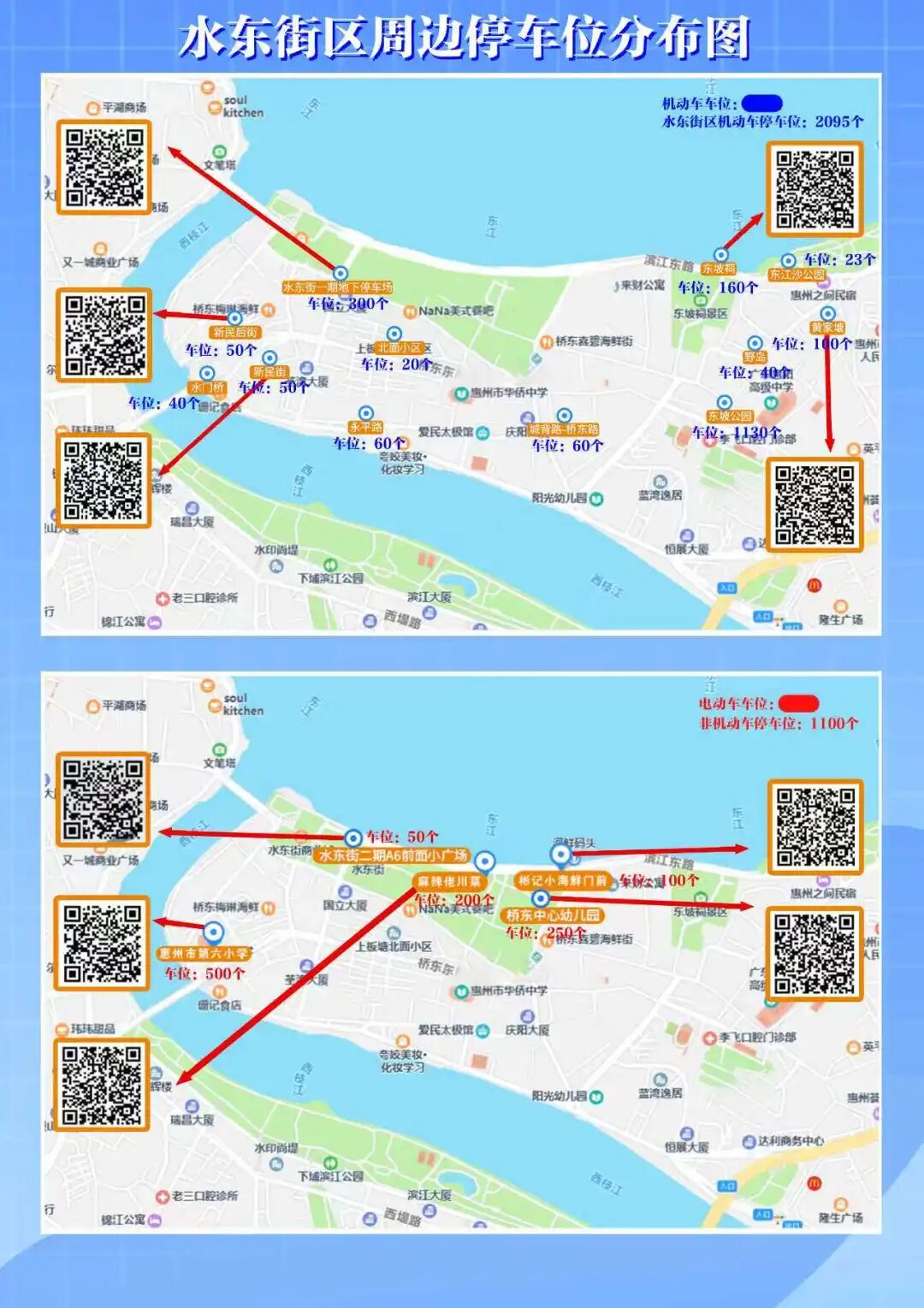 春節(jié)假期(2026年2月16日除夕至2月23日年初七),為方便市民游客出行,堅(jiān)持“疏導(dǎo)結(jié)合、便民利民”原則,惠城區(qū)橋東街道在水東街周邊設(shè)置機(jī)動(dòng)車、非機(jī)動(dòng)車指定停放點(diǎn),其中機(jī)動(dòng)車停車位超2000個(gè),非機(jī)動(dòng)車停車位超1000個(gè),掃描停車分布圖二維碼可一鍵導(dǎo)航,直達(dá)就近停車場(chǎng)。