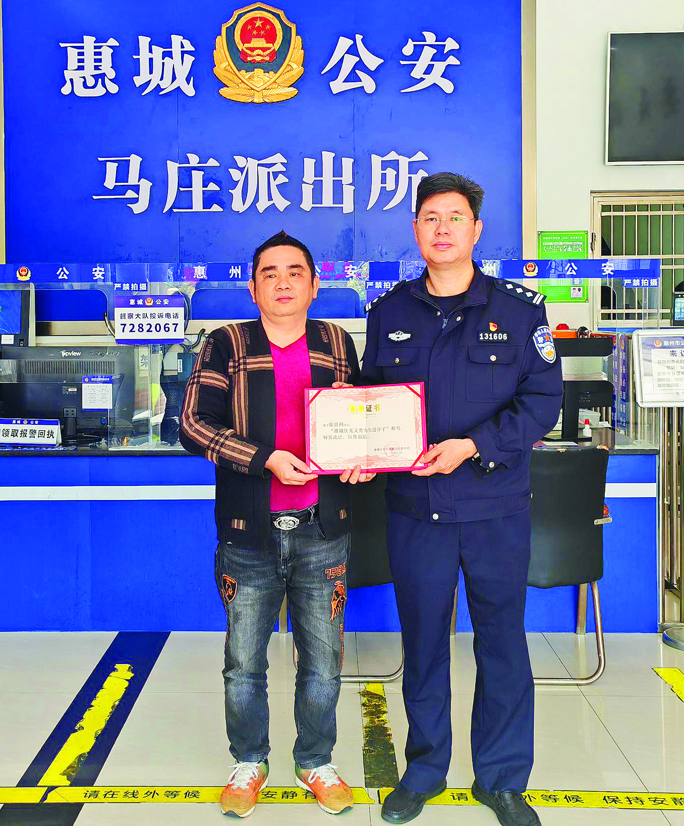 陳貴桐從轄區(qū)派出所民警手里接過“惠城區(qū)見義勇為先進分子”榮譽證書。受訪者供圖