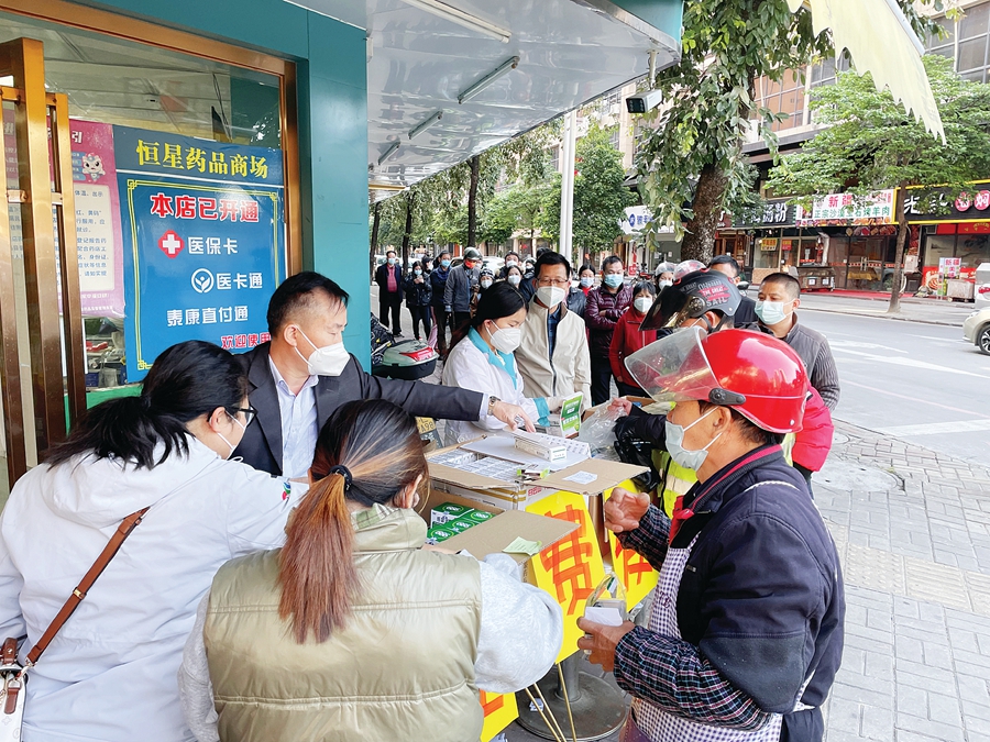 市民排隊免費領(lǐng)藥。 惠州日報記者藍(lán)斐菲 通訊員廖苾羽 攝