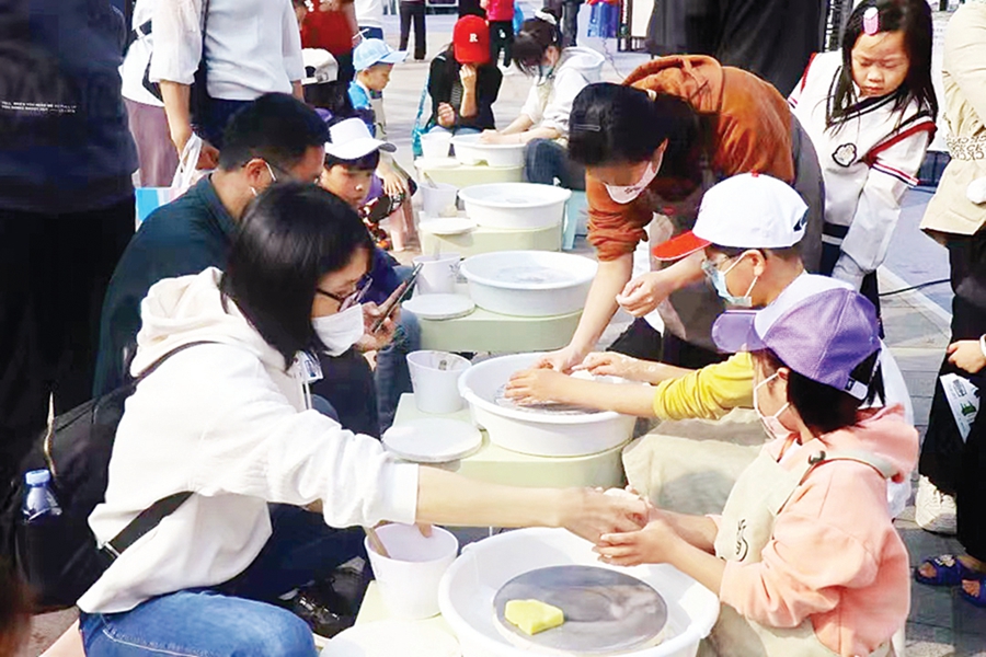 在拓印和制瓷手藝體驗(yàn)攤位前也擠滿了中小學(xué)生。他們?cè)诠ぷ魅藛T的協(xié)助下展開(kāi)想象、動(dòng)手操作,制作了一件件精美的陶藝作品,感受陶藝的魅力。