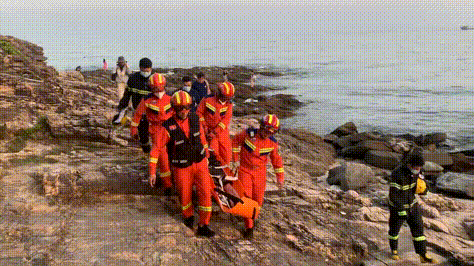 海邊礁石凹凸不平而且濕滑,稍有不慎就會(huì)對傷者造成二次傷害。因此,救援人員小心地將傷者固定在擔(dān)架上,輕輕抬起擔(dān)架,盡可能平穩(wěn)地將傷者從崎嶇不平的礁石上抬至平地等待醫(yī)護(hù)人員的到來。