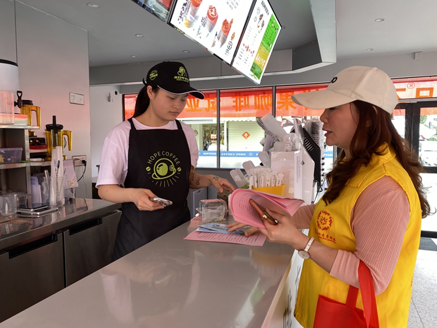 志愿者到商鋪宣傳文明創(chuàng)建。