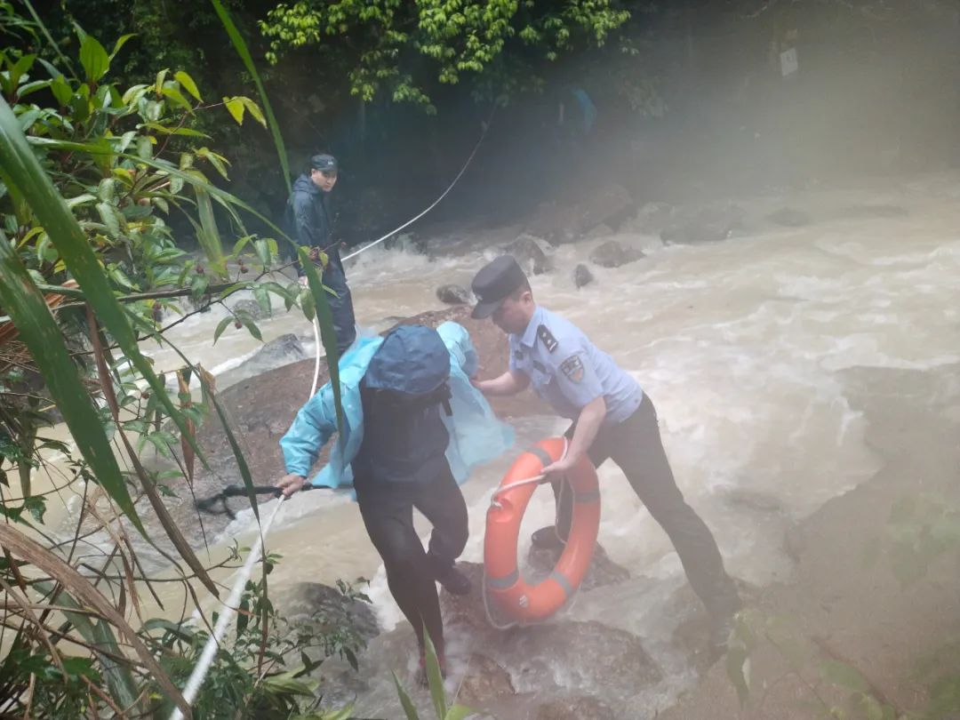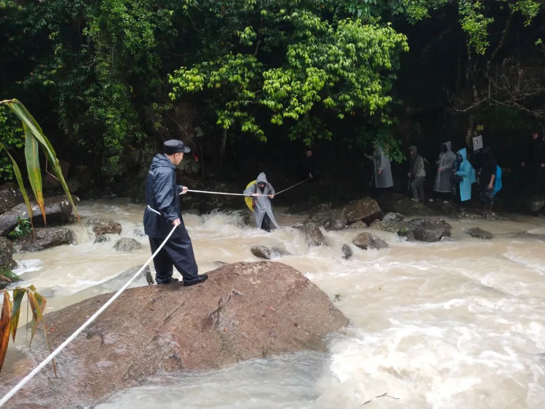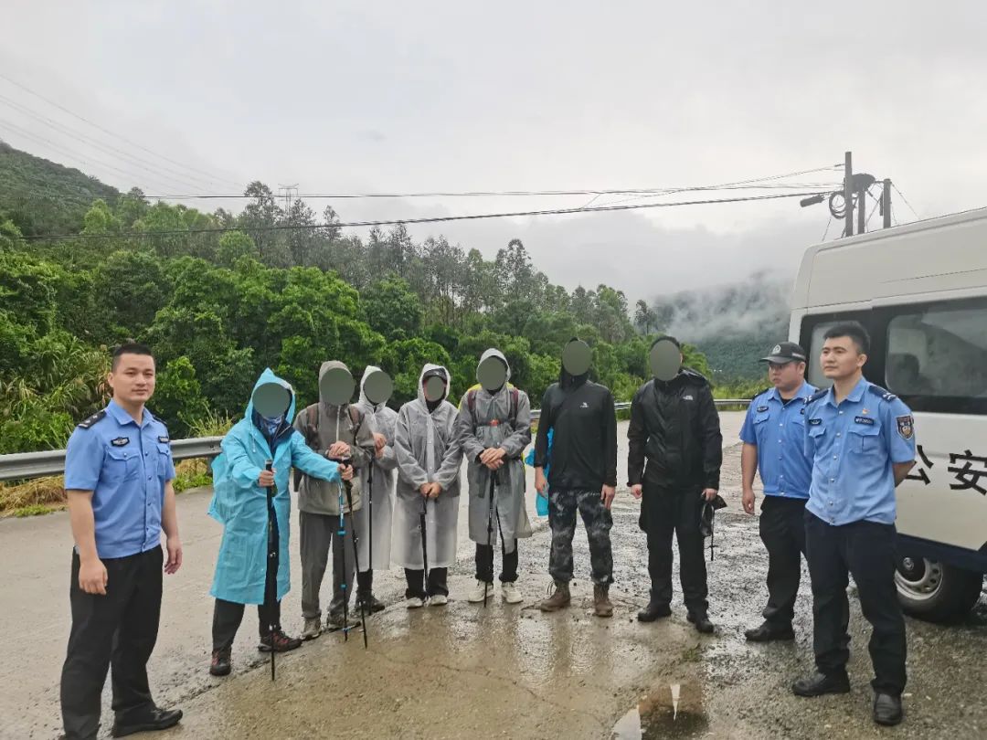 2023年5月7日下午13時,九龍峰派出所接到110轉(zhuǎn)接警情稱:在九龍峰管委會長坑村委南山村有7名驢友因下暴雨突遇河水暴漲被困山上,請求救助。接報后,值班領(lǐng)導(dǎo)立即組織警員前往救援,根據(jù)報警線索,只能確定該驢友大概的位置。山路崎嶇險峻,再加上暴雨沖刷,十分濕滑泥濘,救援人員不顧艱難疲憊,背負(fù)著救援裝備,冒雨在荊棘叢生的山路上徒步1個多小時,終于在山上找到了7名驢友。