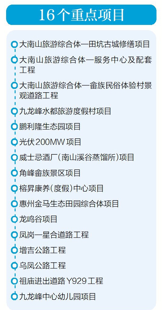 該負(fù)責(zé)人介紹,目前,16個重點(diǎn)項(xiàng)目正按計(jì)劃推進(jìn)。根據(jù)實(shí)際,九龍峰旅游區(qū)力爭年內(nèi)完成大南山旅游綜合體—田坑古城修繕項(xiàng)目、大南山旅游綜合體—服務(wù)中心及配套工程、大南山旅游綜合體—畬族民俗體驗(yàn)村景觀道路、角峰畬族景區(qū)、榕昇康養(yǎng)(度假)中心、惠州金馬生態(tài)田園綜合體項(xiàng)目、鳳崗—星合道路、增吉公路、烏鳳公路、祖廟進(jìn)出道路Y929以及九龍峰中心幼兒園等11個重點(diǎn)項(xiàng)目。