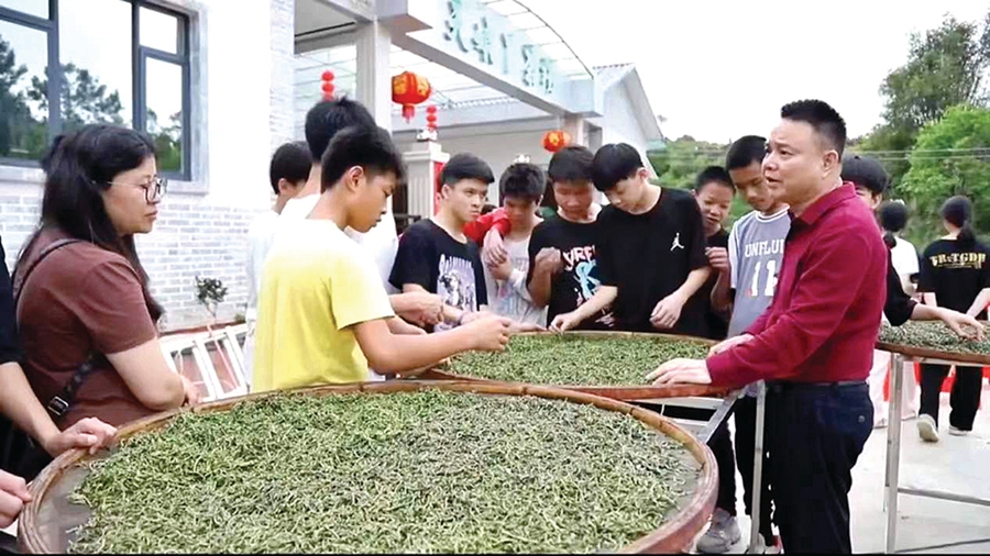 師生參觀炒茶曬茶。 惠州日報記者賴金朗 特約通訊員李文聰 通訊員藍文超 郭錦威 攝