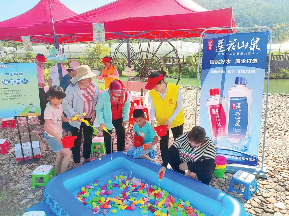 在白盆珠鎮(zhèn)白馬村的河心島上,一個小池子吸引了眾多小朋友玩釣烏龜?shù)挠螒,一只只可愛的“小烏龜”被釣上來,現(xiàn)場充滿了歡聲笑語;在西江月·櫻花茶園,游客按照指定姿勢拍照打卡,并獲得現(xiàn)場打印照片和小禮物獎勵;在白盆珠水庫副壩水文化科普園,游客們現(xiàn)場唱紅歌,熱情高漲。