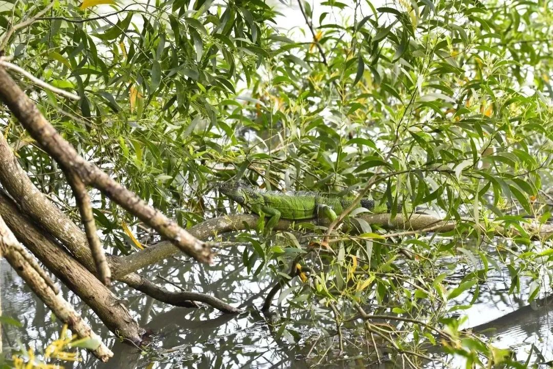 這只有著綠油油的身體、長(zhǎng)長(zhǎng)的尾巴、圓鼓鼓的眼睛以及極具個(gè)性“背刺”的小家伙就是綠鬣蜥。它隱藏在樹葉中,不仔細(xì)觀察很難發(fā)現(xiàn)。