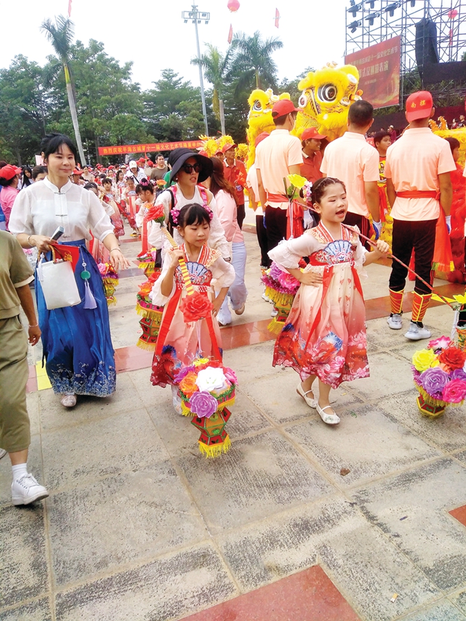 日前,惠東縣平海圩鎮(zhèn)道路兩旁張燈結(jié)彩,古城內(nèi)家家戶戶掛上燈籠和彩旗,一派熱鬧喜慶景象。龍、獅穿梭在古城的大街小巷,鳳舞、舞鯉魚(yú)如精靈般活躍在古樸的街道里!斑@個(gè)鳳舞造型獨(dú)特,舞姿好優(yōu)美!薄翱炜!快看!那個(gè)小孩英歌舞跳得這么好!薄(dāng)?shù)嘏e辦的平海古城第十一屆文化藝術(shù)節(jié)吸引了眾多客人前往觀賞。