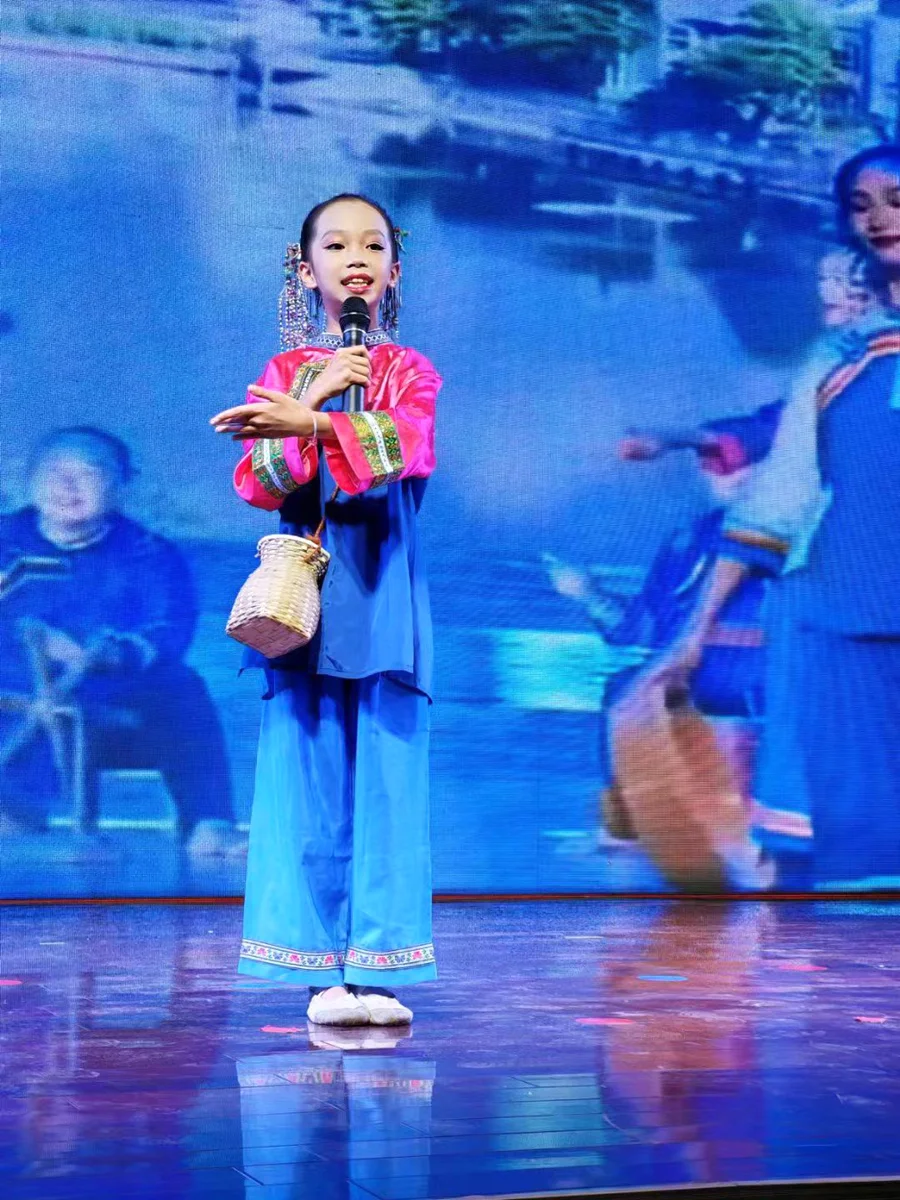 “惠東漁歌是流行于港口、巽寮、稔山、鹽洲等地的漁村傳統(tǒng)音樂,是國家級非物質(zhì)文化遺產(chǎn)之一!薄爸谱髋D味是我珍貴的童年回憶,我要為家鄉(xiāng)的非遺產(chǎn)品代言!被輺|漁歌、臘味制作技藝、客家山歌……比賽現(xiàn)場,20位小選手身著傳統(tǒng)服飾,手持特色道具,活靈活現(xiàn)地給觀眾展示了惠東非物質(zhì)文化遺產(chǎn)的獨特魅力。
