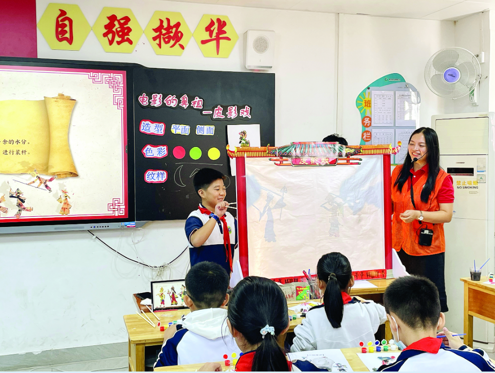 皮影戲表演受到學(xué)生們的歡迎。惠州日?qǐng)?bào)記者賴金朗 通訊員賴順英 攝