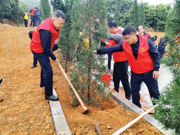 黨員干部在謝洞革命烈士紀念碑前道路兩旁種下松柏。 惠州日報記者蔡偉健 特約通訊員楊瑞發(fā) 潘佳麗 攝