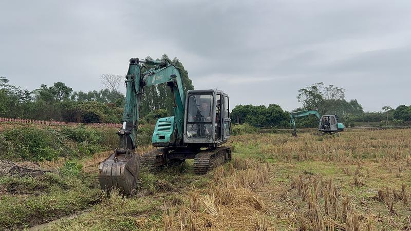 挖掘機在現(xiàn)場挖通灌渠。 惠州日報記者洪鵲兒 實習生曾小幸 攝