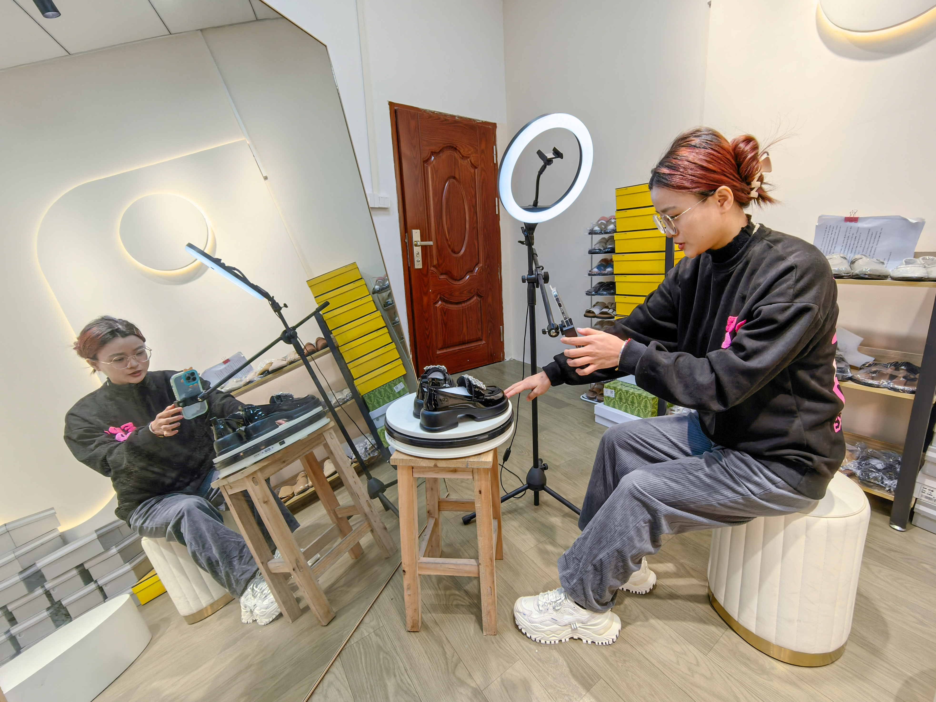 惠東女鞋企業(yè)工作人員直播帶貨;葜萑?qǐng)?bào)記者陳濤 攝