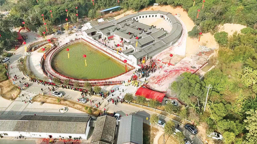 重建的古祝山客家圍龍屋占地約5000平方米,整體呈橢圓形結(jié)構(gòu),按照“三進三堂四橫一圍龍”的布局,共設(shè)9廳18井,99間房,頂部裝飾10堵馬頭墻,具有典型客家圍龍屋的特點。