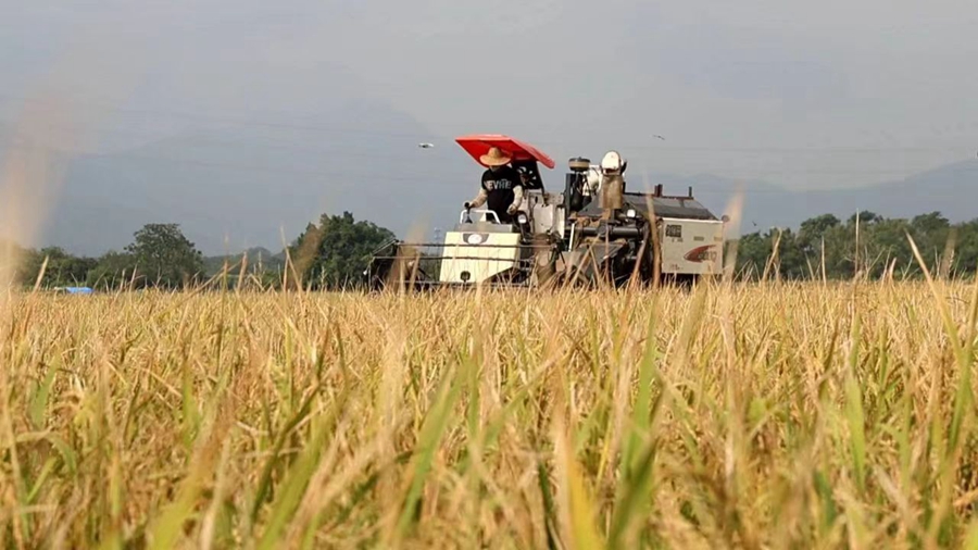 惠東縣加大培訓(xùn)力度,全面推進(jìn)田長(zhǎng)制。圖為村民在收割稻谷。 惠州日?qǐng)?bào)記者蔡偉健 攝