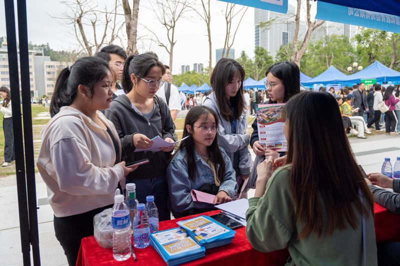 學(xué)生在春季招聘會(huì)攤位了解校招信息。 惠州日?qǐng)?bào)記者洪鵲兒 攝
