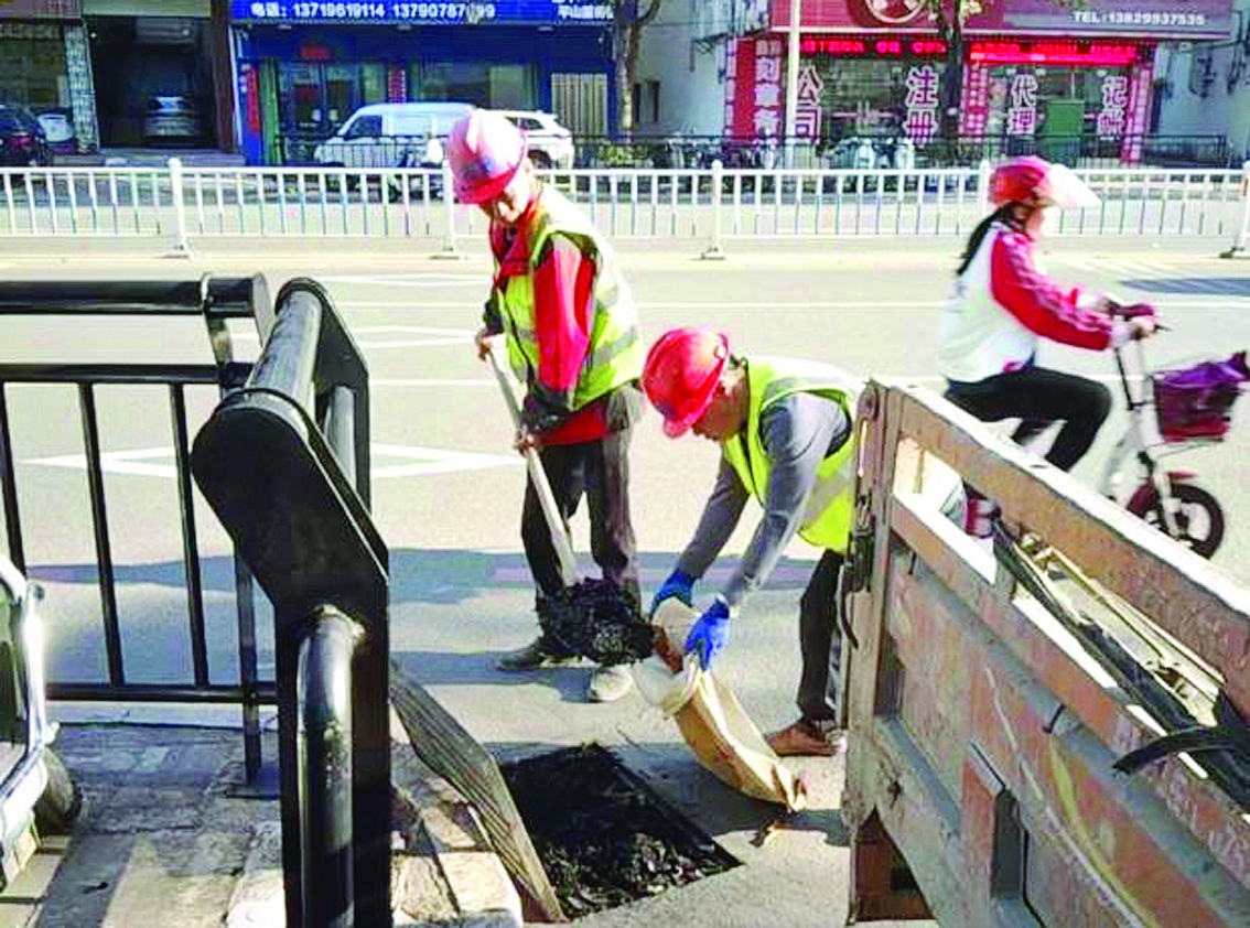 工作人員在平山街道新平大道清理排水口淤泥雜物。