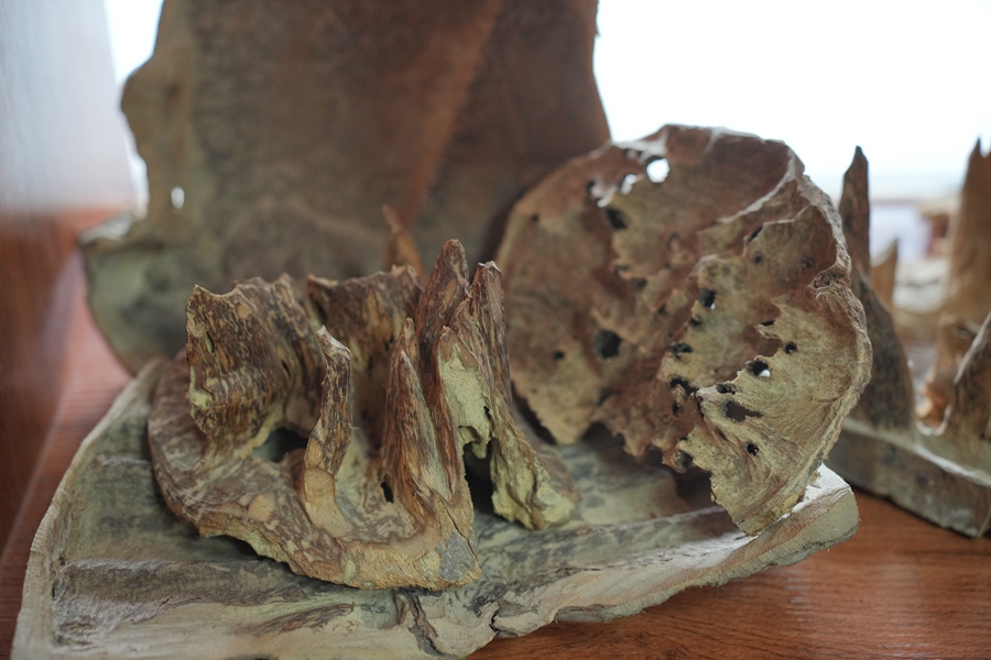 工作人員對沉香木料進(jìn)行檢視。