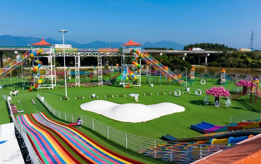 接著,可以驅(qū)車到附近的金馬田園綜合體。該綜合體集兒童樂園、農(nóng)產(chǎn)品加工、鄉(xiāng)村旅游、茶葉種植等于一體。其中的無動力樂園擁有20多種游樂項目,上去便是長長的玻璃棧道。此外還有各式各樣漂亮的秋千、超大的蹦床、彩虹滑道等好玩的項目。