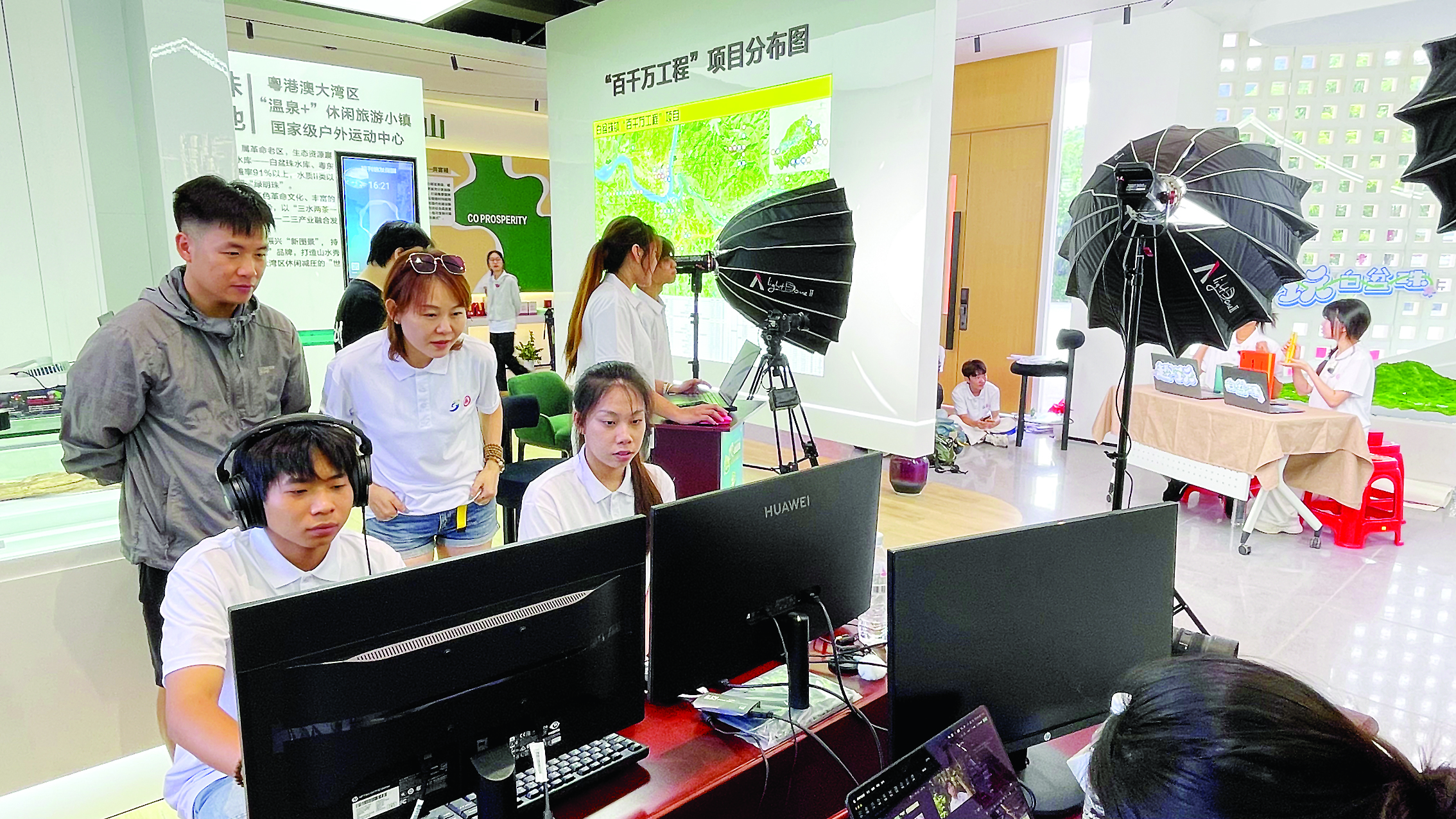 “‘趣’玩白盆珠,點贊深職大!”直播間里傳來一陣陣吶喊聲,原來是“紅金藍綠”農(nóng)文旅直播突擊隊正在直播。這支突擊隊前期對白盆珠鎮(zhèn)文旅資源進行了挖掘分析及實地走訪,并以大學生視角選取了有代表性、符合年輕人文旅偏好的特色景點及線路。他們充分結合影視傳媒的專業(yè)特長,確定了節(jié)目調性及直播形態(tài),通過現(xiàn)場直播推廣白盆珠鎮(zhèn)特色景點,宣傳當?shù)剞r(nóng)特產(chǎn)品,取得明顯成效。