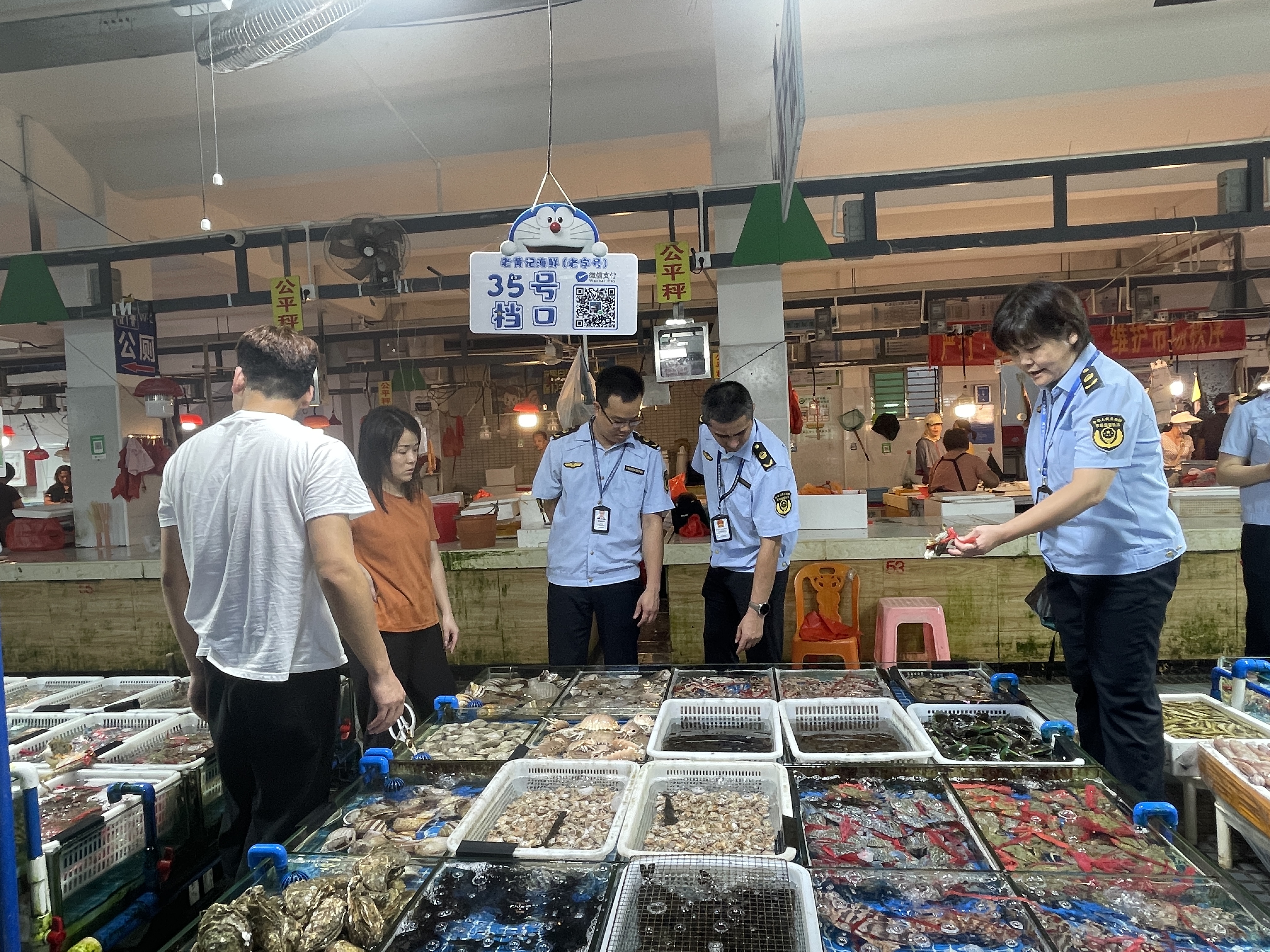 執(zhí)法人員在海鮮市場(chǎng)檢查;葜輺|江圖片社供圖
