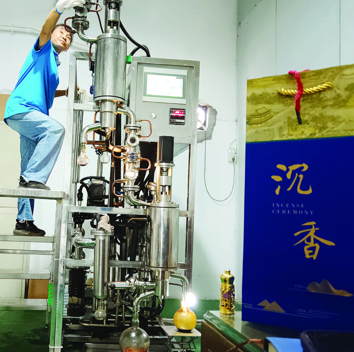 莫蘭秀早早就起來從事她的“香”事業(yè),只見她在車間里,將已經(jīng)碾碎的沉香料裝入一個1米多高的鐵罐里,然后,在其他工人的幫助下裝入萃取機(jī)器進(jìn)行初加工,得到初步原料后進(jìn)入最后的精油萃取階段。從機(jī)器萃取出來的一滴滴棕黃色液體,就是沉香精油。這是惠東縣引入的惠東百泓沉香生物科技有限公司的沉香萃取生產(chǎn)線,也是惠東縣的首條沉香萃取生產(chǎn)線,莫蘭秀是該條生產(chǎn)線的負(fù)責(zé)人!拔覀兪墙衲4月份正式投產(chǎn)的,主要生產(chǎn)沉香精油、棋楠精油!蹦m秀說,“這條生產(chǎn)線我們投入了2000多萬元,一天大概生產(chǎn)10多公斤!被輺|百泓沉香生物科技有限公司相關(guān)負(fù)責(zé)人邱苗介紹,精加工萃取沉香精華,能完整保留沉香的有效成分,在國際香水、香料等高檔產(chǎn)品中運(yùn)用廣泛,目前,該條生產(chǎn)線預(yù)計年產(chǎn)量2噸多,主要銷往國內(nèi)及中東、東南亞等地區(qū),預(yù)計年產(chǎn)值超1億元。