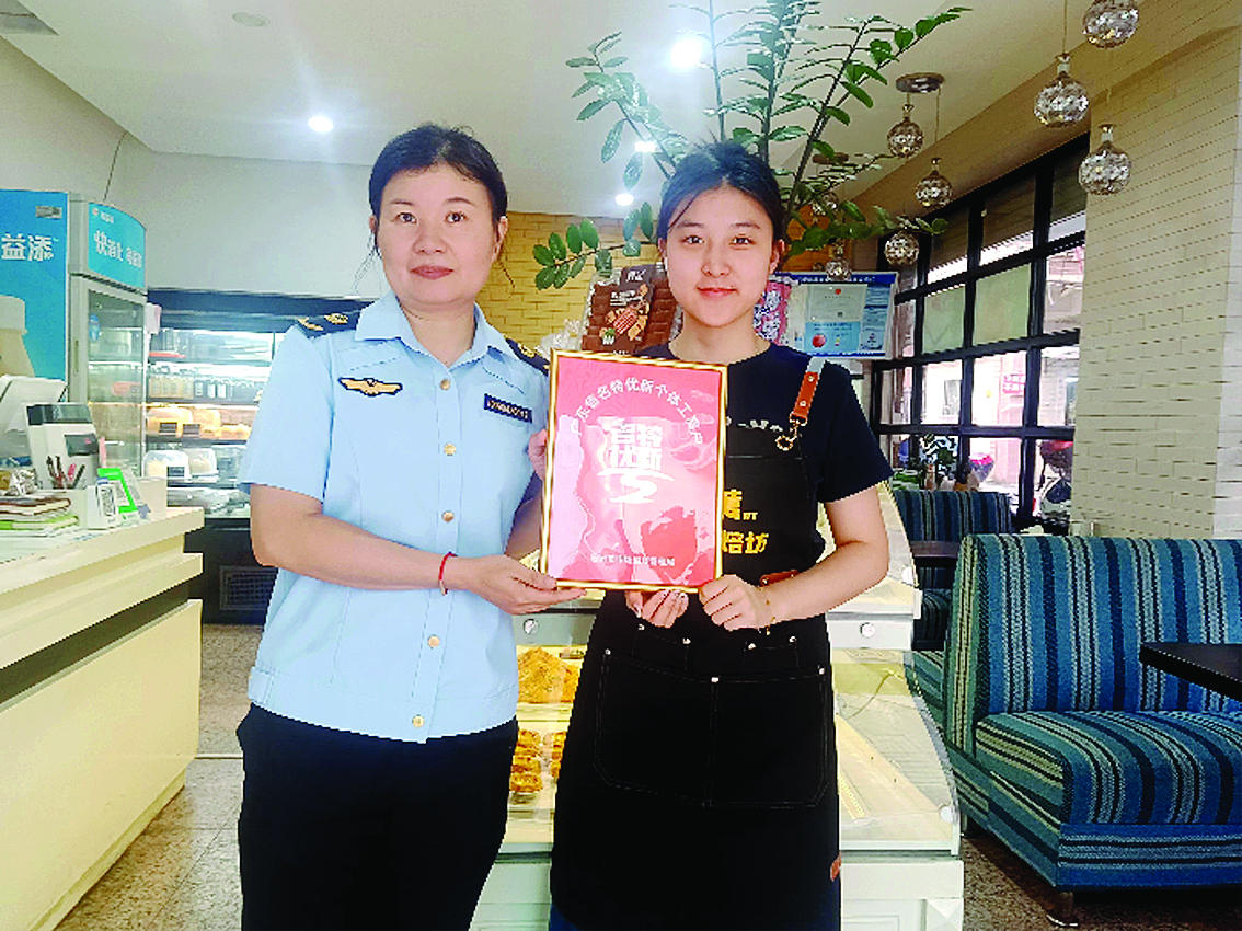 工作人員上門頒發(fā)“名特優(yōu)新”個體工商戶牌匾。