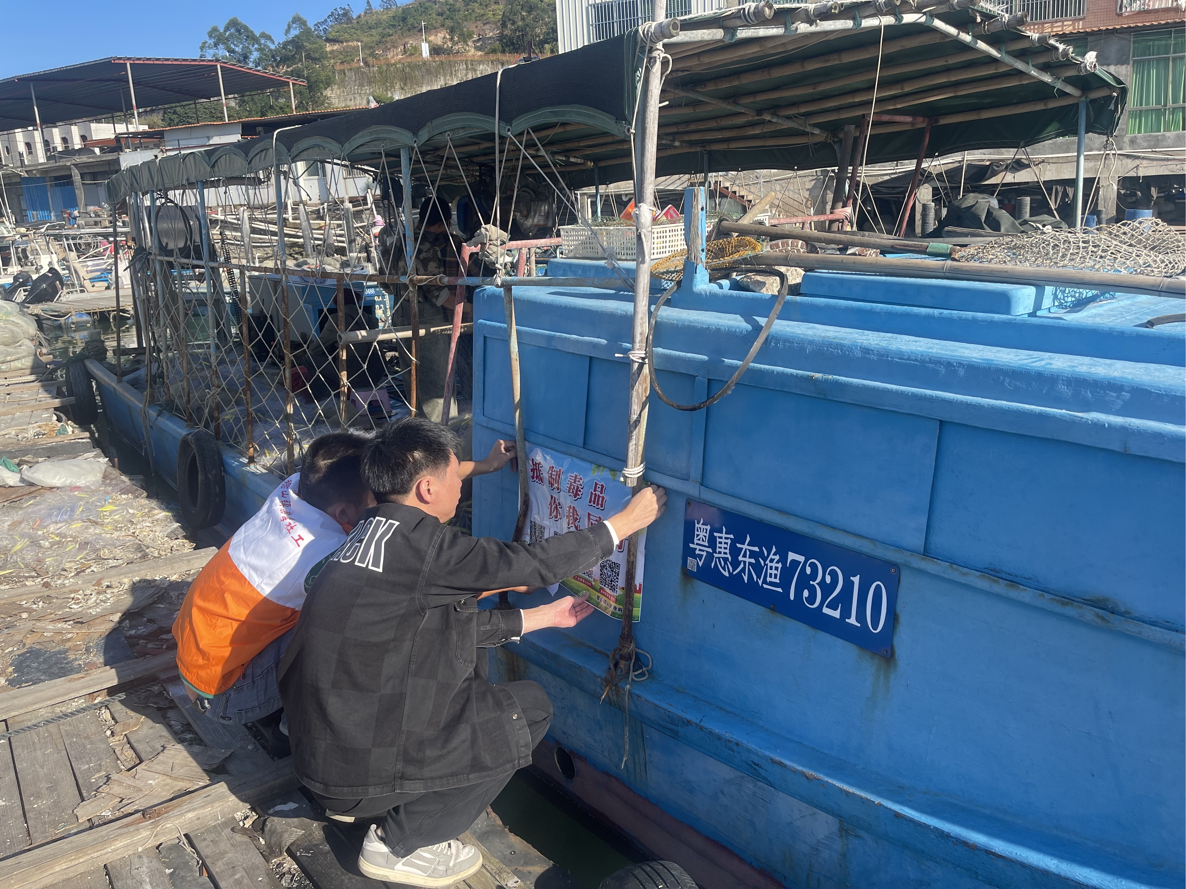 工作人員在漁船上張貼禁毒宣傳單張。 惠州日報記者洪鵲兒 通訊員羅顯偉 攝